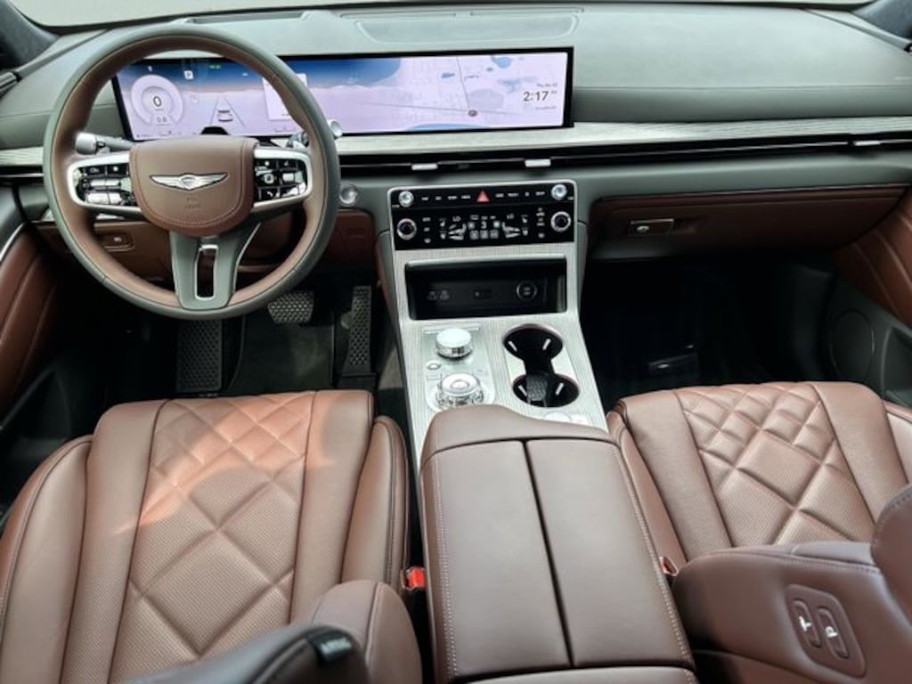 This vehicle comes equipped with Option Group 01, 18 Speakers, 3rd row seats: split-bench, 4-Wheel Disc Brakes, ABS brakes, Adaptive suspension, Air Conditioning, Alloy wheels, AM/FM radio: SiriusXM, Anti-whiplash front head restraints, Auto High-beam Headlights, Auto tilt-away steering wheel, Auto-dimming door mirrors, Auto-dimming Rear-View mirror, Automatic temperature control, Brake assist, Bumpers: body-color, Cargo Net, Compass, Delay-off headlights, Driver door bin, Driver vanity mirror, Dual front impact airbags, Dual front side impact airbags, Electronic Stability Control, Emergency communication system: Genesis Connected Services, Exterior Parking Camera Rear, First Aid Kit, Four wheel independent suspension, Fragrance Cartridge, Front anti-roll bar, Front Bucket Seats, Front Center Armrest, Front dual zone A/C, Front reading lights, Fully automatic headlights, Garage door transmitter: HomeLink, Genuine wood console insert, Genuine wood dashboard insert, Genuine wood door panel insert, Heads-Up Display, Heated and Ventilated Front Bucket Seats, Heated door mirrors, Heated front seats, Heated rear seats, Heated steering wheel, Illuminated entry, Knee airbag, Leather steering wheel, Low tire pressure warning, Memory seat, Nappa Leather Seating Surfaces, Navigation System, NFC Key Card, Occupant sensing airbag, Outside temperature display, Overhead airbag, Overhead console, Panic alarm, Passenger door bin, Passenger vanity mirror, Power door mirrors, Power driver seat, Power Liftgate, Power moonroof, Power passenger seat, Power steering, Power windows, Radio data system, Radio: AM/FM/HD Bose Premium Sound System, Rain sensing wipers, Rear air conditioning, Rear anti-roll bar, Rear reading lights, Rear seat center armrest, Rear side impact airbag, Rear window defroster, Rear window wiper, Reclining 3rd row seat, Remote keyless entry, Roadside Assistance Kit, Security system, Severe Weather Kit, Speed control, Speed-sensing steering, Speed-Sensitive Wipers, Split folding rear seat, Spoiler, Steering wheel memory, Steering wheel mounted audio controls, Tachometer, Telescoping steering wheel, Tilt steering wheel, Traction control, Trip computer, Turn signal indicator mirrors, Variably intermittent wipers, Ventilated front seats, Ventilated rear seats, and Wheels: 22" x 9.5J Dark Gray Matte Alloy .