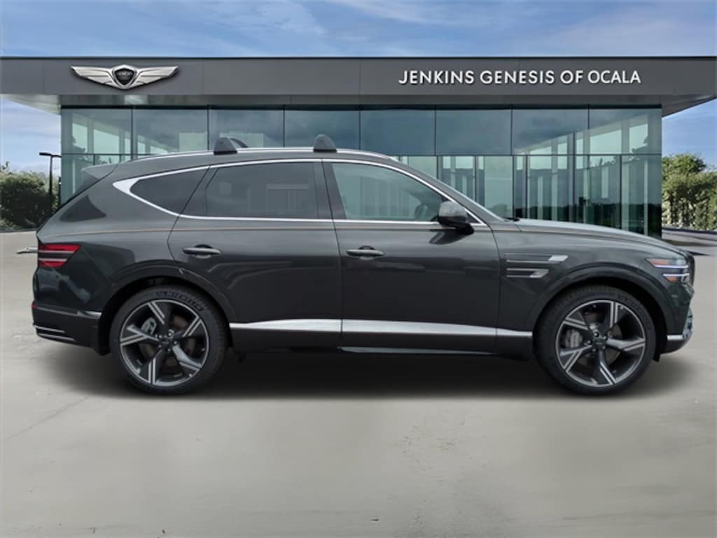 This vehicle comes equipped with Option Group 01, 18 Speakers, 3rd row seats: split-bench, 4-Wheel Disc Brakes, ABS brakes, Adaptive suspension, Air Conditioning, Alloy wheels, AM/FM radio: SiriusXM, Anti-whiplash front head restraints, Auto High-beam Headlights, Auto tilt-away steering wheel, Auto-dimming door mirrors, Auto-dimming Rear-View mirror, Automatic temperature control, Brake assist, Bumpers: body-color, Cargo Net, Compass, Delay-off headlights, Driver door bin, Driver vanity mirror, Dual front impact airbags, Dual front side impact airbags, Electronic Stability Control, Emergency communication system: Genesis Connected Services, Exterior Parking Camera Rear, First Aid Kit, Four wheel independent suspension, Front & Rear Mudguards, Front anti-roll bar, Front Bucket Seats, Front Center Armrest, Front dual zone A/C, Front reading lights, Fully automatic headlights, Garage door transmitter: HomeLink, Genuine wood console insert, Genuine wood dashboard insert, Genuine wood door panel insert, Heads-Up Display, Heated & Ventilated Front Bucket Seats, Heated door mirrors, Heated front seats, Heated rear seats, Heated steering wheel, Illuminated entry, Knee airbag, Leather steering wheel, Low tire pressure warning, Memory seat, Nappa Leather Seating Surfaces, Navigation System, NFC Key Card, Occupant sensing airbag, Outside temperature display, Overhead airbag, Overhead console, Panic alarm, Passenger door bin, Passenger vanity mirror, Power door mirrors, Power driver seat, Power Liftgate, Power moonroof, Power passenger seat, Power steering, Power windows, Radio data system, Radio: AM/FM/SiriusXM/HD Bang & Olufsen Sound Sys, Rain sensing wipers, Rear air conditioning, Rear anti-roll bar, Rear dual zone A/C, Rear reading lights, Rear seat center armrest, Rear side impact airbag, Rear window defroster, Rear window wiper, Reclining 3rd row seat, Remote keyless entry, Security system, Speed control, Speed-sensing steering, Speed-Sensitive Wipers, Split folding rear seat, Spoiler, Steering wheel memory, Steering wheel mounted audio controls, Tachometer, Telescoping steering wheel, Tilt steering wheel, Traction control, Trip computer, Turn signal indicator mirrors, Variably intermittent wipers, Ventilated front seats, Ventilated rear seats, and Wheels: 22" x 9.5J Dark Gray Matte Alloy .