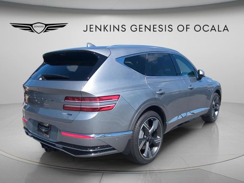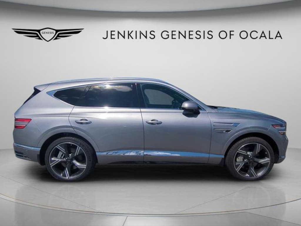 This vehicle comes equipped with Option Group 01, 18 Speakers, 3rd row seats: split-bench, 4-Wheel Disc Brakes, ABS brakes, Adaptive suspension, Air Conditioning, Alloy wheels, AM/FM radio: SiriusXM, Anti-whiplash front head restraints, Auto High-beam Headlights, Auto tilt-away steering wheel, Auto-dimming door mirrors, Auto-dimming Rear-View mirror, Automatic temperature control, Brake assist, Bumpers: body-color, Cargo Blocks, Compass, Delay-off headlights, Driver door bin, Driver vanity mirror, Dual front impact airbags, Dual front side impact airbags, Electronic Stability Control, Emergency communication system: Genesis Connected Services, Exterior Parking Camera Rear, First Aid Kit, Four wheel independent suspension, Fragrance Cartridge, Front anti-roll bar, Front Bucket Seats, Front Center Armrest, Front dual zone A/C, Front reading lights, Fully automatic headlights, Garage door transmitter: HomeLink, Genuine wood console insert, Genuine wood dashboard insert, Genuine wood door panel insert, Heads-Up Display, Heated and Ventilated Front Bucket Seats, Heated door mirrors, Heated front seats, Heated rear seats, Heated steering wheel, Illuminated entry, Knee airbag, Leather steering wheel, Low tire pressure warning, Memory seat, Nappa Leather Seating Surfaces, Navigation System, NFC Key Card, Occupant sensing airbag, Outside temperature display, Overhead airbag, Overhead console, Panic alarm, Passenger door bin, Passenger vanity mirror, Power door mirrors, Power driver seat, Power Liftgate, Power moonroof, Power passenger seat, Power steering, Power windows, Radio data system, Radio: AM/FM/HD Bose Premium Sound System, Rain sensing wipers, Rear air conditioning, Rear anti-roll bar, Rear reading lights, Rear seat center armrest, Rear side impact airbag, Rear window defroster, Rear window wiper, Reclining 3rd row seat, Remote keyless entry, Roof Rack Cross Bars, Security system, Speed control, Speed-sensing steering, Speed-Sensitive Wipers, Split folding rear seat, Spoiler, Steering wheel memory, Steering wheel mounted audio controls, Tachometer, Telescoping steering wheel, Tilt steering wheel, Traction control, Trip computer, Turn signal indicator mirrors, Variably intermittent wipers, Ventilated front seats, Ventilated rear seats, and Wheels: 22" x 9.5J Dark Gray Matte Alloy .