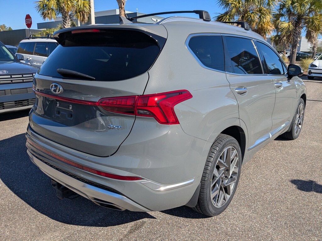 The price does not include tax, tag, license, an electronic filing fee of $449.00**, a private tag agency fee of $199.00**, and a predelivery service charge of $1199.00** **This charge represents costs and profit to the dealer for items such as inspecting, cleaning, and adjusting vehicles, as well as preparing documents related to the sale. * EPA-estimate metric: these are contingent on ideal conditions within a lab. Real-world situations such as carrying passengers or cargo, using climate control, driving style, and ambient temperatures can affect actual metrics. 22/28 City/Highway MPG Clean CARFAX. This 2022 Hyundai Santa Fe Calligraphy in Hampton Gray features Option Group 01, 12 Speakers, 4-Wheel Disc Brakes, ABS brakes, Air Conditioning, Alloy wheels, AM/FM radio: SiriusXM, Apple CarPlay & Android Auto, Auto High-beam Headlights, Auto-dimming Rear-View mirror, Automatic temperature control, Axle Ratio: 3.316, Brake assist, Bumpers: body-color, Cargo Tray, Carpeted Floor Mats, Delay-off headlights, Driver door bin, Driver vanity mirror, Dual front impact airbags, Dual front side impact airbags, Electronic Stability Control, Emergency communication system, Four wheel independent suspension, Front anti-roll bar, Front Bucket Seats, Front Center Armrest, Front dual zone A/C, Front reading lights, Fully automatic headlights, Garage door transmitter: HomeLink, harman/kardon® Speakers, Heads-Up Display, Heated & Ventilated Front Bucket Seats, Heated door mirrors, Heated front seats, Heated rear seats, Heated steering wheel, Illuminated entry, Leather steering wheel, Low tire pressure warning, Memory seat, Mudguards, Navigation System, Occupant sensing airbag, Outside temperature display, Overhead airbag, Overhead console, Panic alarm, Passenger door bin, Passenger vanity mirror, Power door mirrors, Power driver seat, Power Liftgate, Power moonroof, Power passenger seat, Power steering, Power windows, Quilted Premium Nappa Leather Seat Trim, Radio: AM/FM Harman Kardon Display Audio, Rain sensing wipers, Rear anti-roll bar, Rear seat center armrest, Rear window defroster, Rear window wiper, Remote keyless entry, Roof Rack Cross Bars, Security system, Speed control, Speed-sensing steering, Split folding rear seat, Spoiler, Steering wheel mounted audio controls, Tachometer, Telescoping steering wheel, Tilt steering wheel, Tow Hitch, Traction control, Trip computer, Turn signal indicator mirrors, Variably intermittent wipers, Ventilated front seats, and Wheels: 20" x 8.0J Alloy . Visit our showroom 24/7 at Jenkinshyundaiofjacksonville or call 904-420-3100. FWD